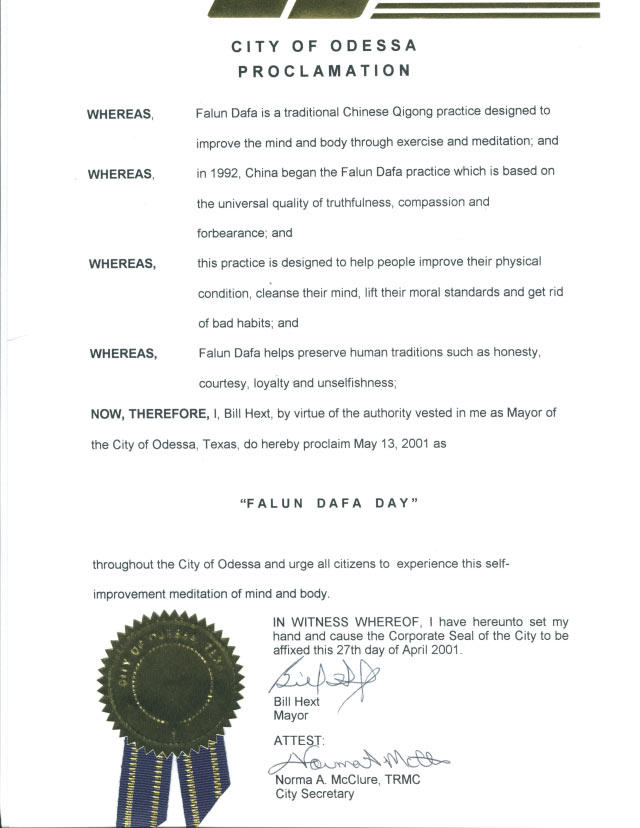 【明慧网2001年5月14日】德州奥德赛市市长宣布2001年5月13日为“法轮大法日”。