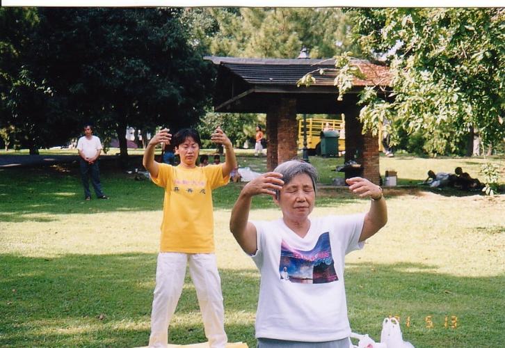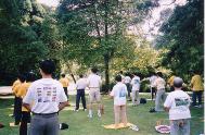 【明慧网2001年5月15日】五月十三日的新加坡。清晨学员们分散在全岛多个地方炼功,并身着印有大法字样的衣服走街串巷,以期民众通过与学员的当面接触对大法有更多了解。下午,学员们在新加坡植物园集体炼功。虽然不能够摆放大法简介,学员们各式各样的大法服装包含了各种信息:法轮大法在世界各地,炼功图片,大法简介,或短而有力的语句,如“法轮大法是正法”;同时展示了大法的美好。集体炼功结束,学员们三三俩俩步行在新加坡最繁华地带。新加坡学员以向世人洪法这种方式,庆祝师尊传法大法九周年并庆祝世界法轮大法日。