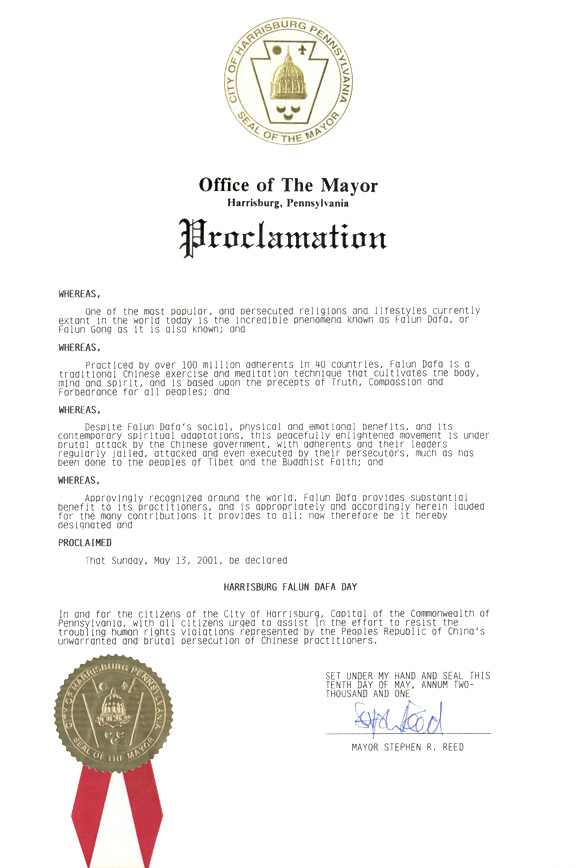 【明慧网2001年5月15日】宾西法尼亚州哈里斯堡市宣布2001年5月13日为“法轮大法日”