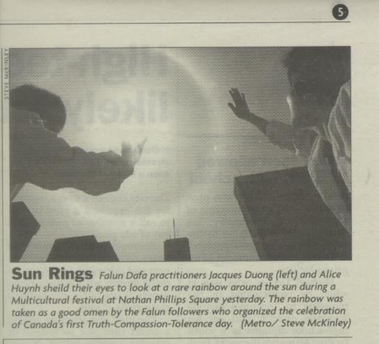 【明慧网2001年5月15日】多伦多都市报2001年5月14日对多伦多首届“加拿大真、善、忍日”报导中的照片“环绕太阳的奇特彩虹”。