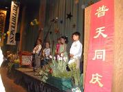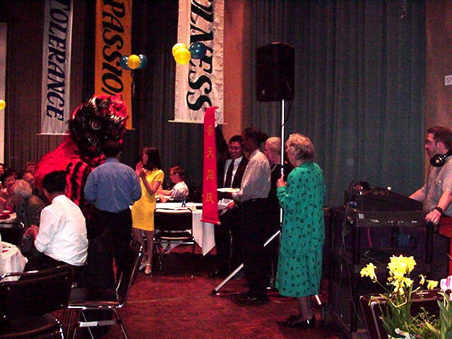 八点一刻左右,有学员参加的刚劲勇猛的舞狮表演拉开了晚会的序幕,“雄狮”行进到主席台前时,抖开一面挂幅,上书“普天同庆”,人们掌声雷动。