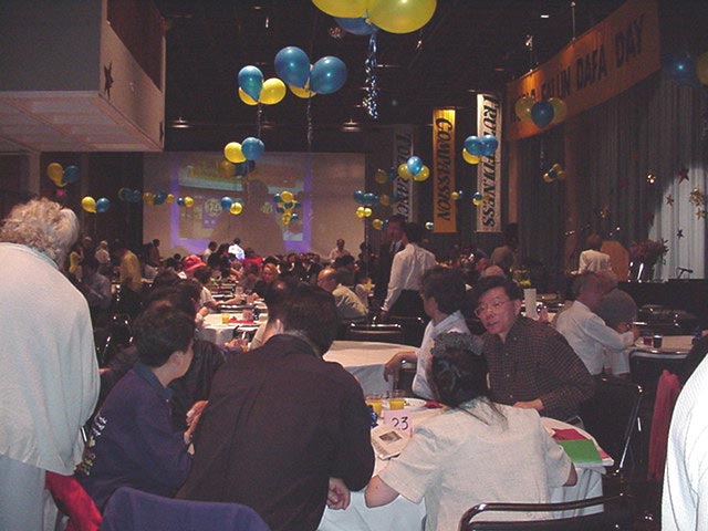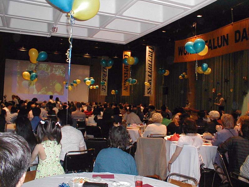 5月11日晚麻省理工学院学生中心二层的大厅里一片节日气氛。舞台帷幕上一行大字世界法轮大法日,厅顶垂下条条挂幅,上书真善忍,黄色和蓝色的气球飘扬在空中。三百多位新英格兰地区大法学员,亲朋好友,来宾汇聚一堂,同庆大法洪传人间九周年。这也是连续三天庆祝活动的序曲。