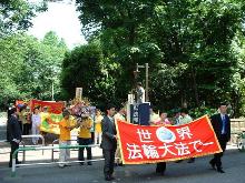 清晨,天气晴朗,春风轻拂,各地学员不断汇集到东京都板桥区的大山公园,在一片祥和的气氛中,进行了集体炼功,向人们展示了5套优雅的功法。当时就吸引了一些有缘人向学员请教功法动作。参加炼功的既有不少中国人、日本人弟子,也有来自马来西亚、澳洲的弟子,还有刚刚走进修炼队伍的韩国、印度的有缘之士。