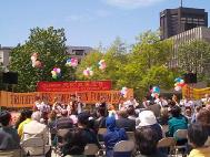 学员们邀请了许多不同族裔的团体、机构来到广场共设展点同庆,十几个展点向人们展示了不同民族风格的人文和风土,吸引了许多游人的目光,一场由各专业演出团体表演的精彩纷呈的音乐歌舞,使欢快的气氛从早上11点一直贯穿到下午四点庆典的结束。时逢母亲节,许多的父母带着他们的孩子加入到了这欢乐的海洋之中。为了让孩子们尽情地享受快乐,学员们精心为他们准备了许多有趣的活动。画脸桌前,一个又一个表情满意的孩子欢笑着离开;蹦蹦床上,孩子们旺盛的精力得以充份的展现;长长的画纸上,数不清的孩子留下了他们稚气但却纯朴的作品。而在整个广场上忙前忙后为大家服务的,则是一个个衣着端庄喜庆,面带微笑的法轮功修炼人。主席台上不断穿插的,是到场的政府要员对真、善、忍日高度赞赏和祝贺的讲话,以及学员对法轮大法及真、善、忍的简短介绍。