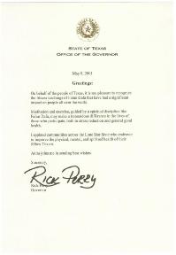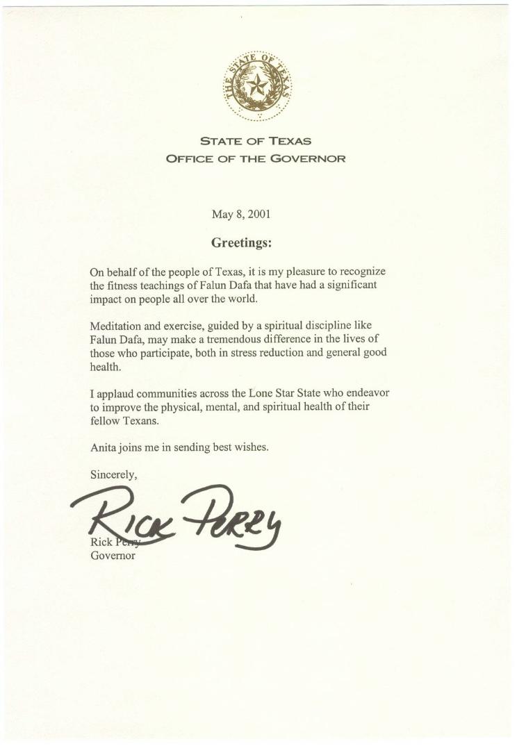 恭贺! 我非常高兴地代表德克萨斯州人民嘉奖法轮大法的适宜教导对全世界人民的巨大影响。