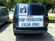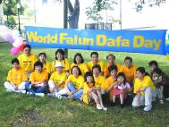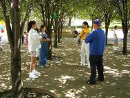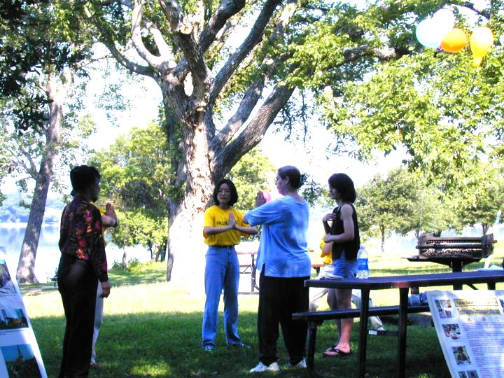经过近3个小时的炼功和心得交流,我们结束了在达拉斯的洪法活动,又一行车队向几十里外的福特沃斯市(Fort Worth)市中心的瀑布公园进发。到了那里之后发现,由于天气十分炎热,公园的人造大瀑布周围吸引了很多游人并有许多小孩在戏水,我们就选在瀑布旁边的树林中布支起了“法轮大法”和“真,善,忍”的横幅和展板,并向过往的游人发放传单。同时学员又做了许多彩色氢气球,上面用不干胶贴上了“法轮大法”和“真,善,忍”的字样,送给过往的孩子们。我们的展板很快就吸引了大量的游人驻足观看,并向我们询问中国镇压法轮功的情况,还有的游人马上就要求向我们学功。另一边,我们事先联系好的《达拉斯时报》的两名记者也来到现场,对我们进行了详细认真的采访,并拍摄了我们集体炼功的照片。(她们的正面新闻报导于第二日就见报了。)