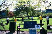 庆祝“世界法轮大法日”暨李洪志师父传法九周年,爱尔兰学员于5月12日在都柏林最繁华的商业步行街(Grafton)集体炼功、洪法。多雨季节的爱尔兰,这一周来天气却出奇地晴朗,因此过往行人特别多。