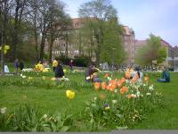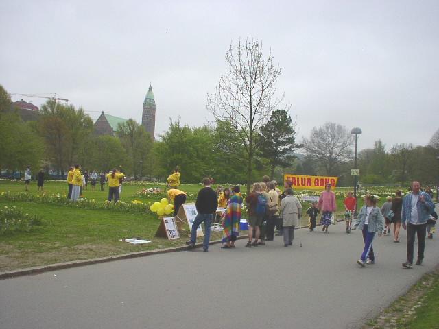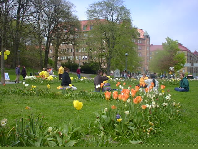 下午晚些时候,我们移到斯劳特公园(Slottparken)继续洪法。我们遇到一位深受法轮功鼓舞的女士,和一位曾在中国深圳居住过的瑞典男子,他1999年亲眼目睹过天安门广场上对法轮功学员的逮捕和虐待,但对我们缺乏了解。