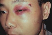 照片摄于2001年3月18日。该学员是17日到天安门和平请愿,在警车里被警察殴打成这样的。