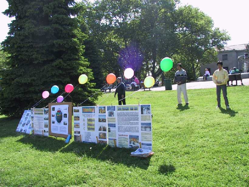 【明慧网2001年5月22日】五月十三日这天,匹兹堡风和日丽。学员们一早就来到杉纳丽公园,庆祝师父洪传大法九周年,庆祝第二届世界法轮大法日。这天正值附近举行一项大型活动,众多游客不时驻足观看学员炼功,并与学员交谈。将近三小时内逾千份大法的真相资料被游客欣然接受,这次活动取得了很好的洪法效果。
