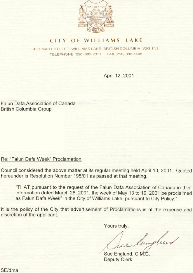 【明慧网2001年5月23日】加拿大不列颠哥伦比亚省维连姆斯湖市宣布2001年5月13-19日为“法轮大法周”。