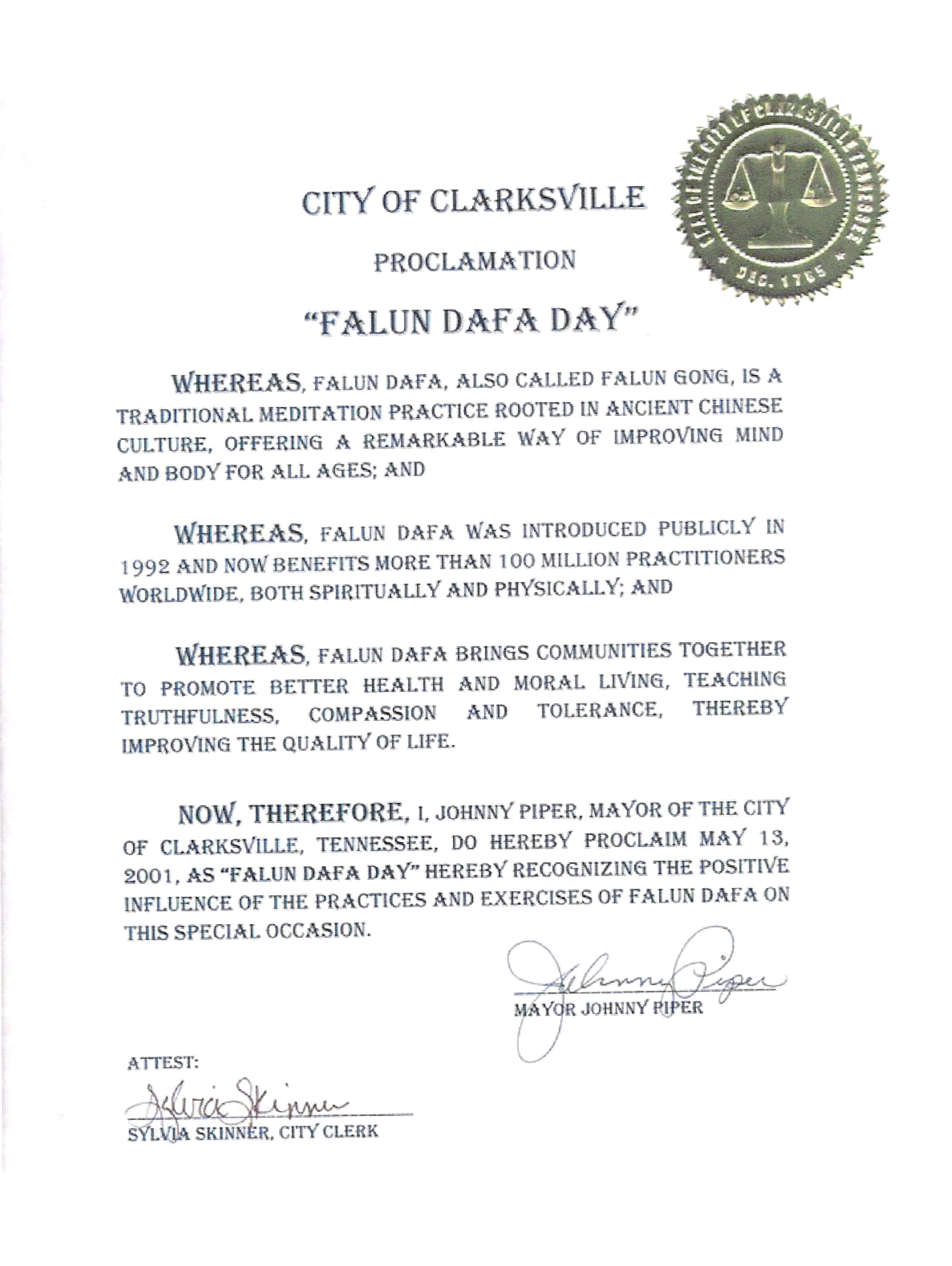 我,约翰尼.派伯,作为田纳西州克拉克维尔市市长,特此宣布2001年5月13日为“法轮大法日”,褒奖这一功法积极的作用。