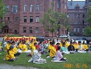 从四面八方赶来的多伦多地区大法弟子们,双盘静坐,单手立掌于胸前,以“顶天独尊”的大法中的神的境界,与全世界的大法弟子们一道,在人世间的此时此刻,向整个三界发出最纯正的一念:“法正乾坤,邪恶全灭”!