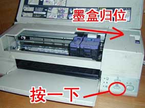 按住加水键三秒钟,墨盒会移出后停住(如指示灯会不闪烁的时候想加水的话,按住加水键三秒钟后,墨盒会来回移动,不会停住,那就要趁墨盒移到位时切段电源,才能使墨盒停住)