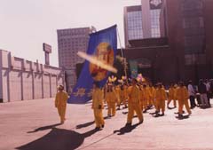最令人欣喜的是一个看不见的旋转的法轮悄悄地加入了我们的队伍,据摄影师和冲印照片的人讲,游行中拍摄的照片显示有一个旋转的法轮从天而降停在法轮旗上,在消失在天空中之前还拥抱了所有的大法弟子。在拍照的那一刻,肉眼看不见法轮。