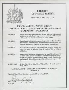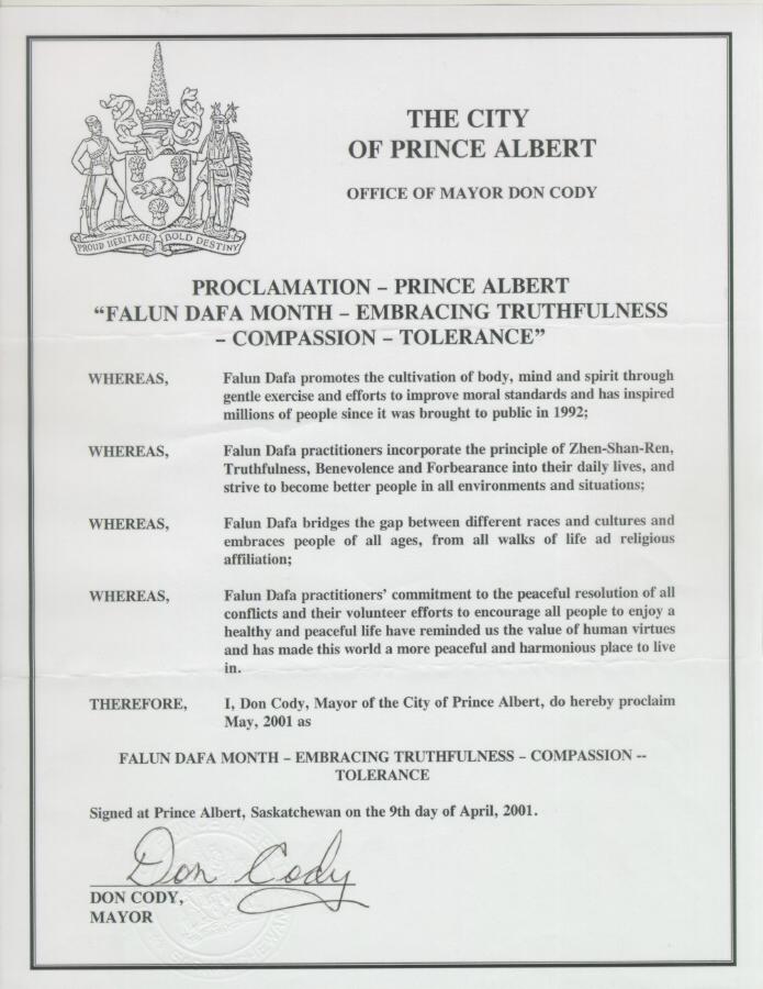【明慧网2001年5月9日】加拿大萨斯喀彻温省阿尔伯特王子市宣布2001年5月为“法轮大法真善忍月”