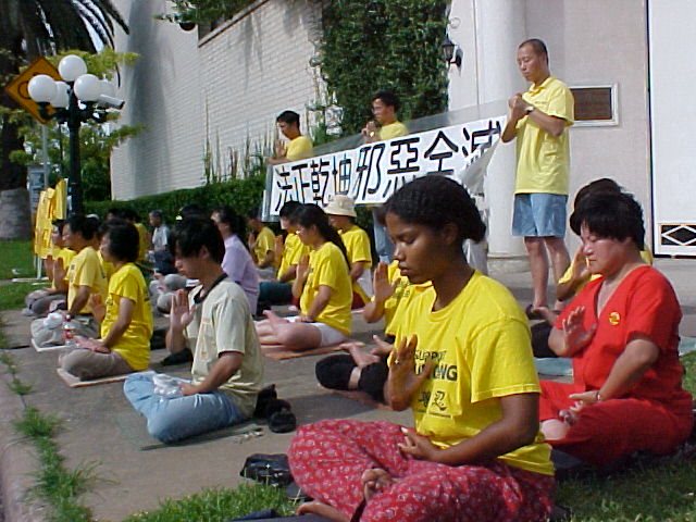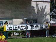 休士顿大法弟子于五月二十六日在中领馆前发正念时才经过暴风雨的洗礼,现又在五月二十九日在中领馆前经受火焰山高温的锤炼,真是天上人间考验一齐来,看其如何承受;然而休士顿大法弟子心中永存正念,他们不怕休士顿盛夏的骄阳,更不怕邪恶最后垂死的挣扎,他们与全世界大法弟子同时再发正念,铲除邪恶.真是:立掌乾坤震,正念显神威,“法正乾坤,邪恶全灭”的强大无比的正念一发出,有功能的大法弟子马上知道从身体内飞速射出串串法轮,它们是神弹,是神器,直接射向邪恶,有功能的大法弟子见到上空有威严巨大的佛,也与大法弟子同时立掌除邪恶,正如师父在2001年加拿大法轮大法修炼心得交流会上的讲法中第四段末尾话:”不只是你们清除,如果修炼人清除不了,那神、直至更高的神,也要参与清除。”天上人间的善与恶的交战非常激烈,然而邪恶只剩下了一层人皮。休士顿大法弟子决心乘胜追击,彻底根除三界内一切邪恶。