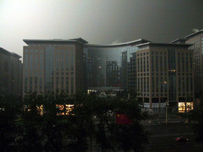 【明慧网二零零一年六月十八日】“天怎么黑了?”6月16日这天中午不少人在这样询问。记者朝窗外望去,只见京城笼罩在一片青黑色之中,远处的高楼变得异常陌生,长安街上行驶的汽车一瞬间开了灯,如同夜晚般在路上留下长长的流光,一处工地的焊枪喷出的火花在“黑色”中成了乳白色光芒。此时为12时45分,5分钟后暴雨如注,天空一下子变“白”了。有朋友说,这景况让人不由想起了76年那个灾难的夏天。