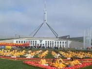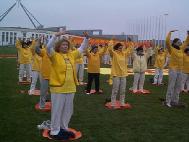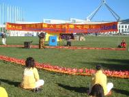 6月16、17日,在坎培拉的市中心、格里布公园(Gleb Park)、国家首都展览馆、中国大使馆前,均悬挂着中英文大法横幅“法轮大法”、“真、善、忍”,并设有法轮大法信息资料台,并摆放着中、英文版《转法轮》、大法简介及真象材料、五套功法演示。在市中心的洪法现场,围绕着一个大花坛,摆放着11块揭露国内大法弟子在监狱被江泽民集团酷刑致死、致残的真象图文大型展板。同时还可见一块反映世界各地大法弟子洪法炼功场面的大型展板。澳洲现正值冬季,但仍可见大批的大陆游客光临。在中国大使馆前,当大法弟子派发真象材料给来自大陆的游客、并与他们交谈时,一位大陆青年马上作出很理解的反应,并说:“江泽民已经很弱了。”但也有遇到一些不明真相的游客,如一次,一个人见大法弟子在发真象资料,便大声嚷嚷:“你回去吧,不要在这里发资料,他们不看……”并骂出脏话。这时一位大法弟子对他说:“你我都是当地居民,享有人权及言论、信仰自由,而在中国大陆,江泽民对法轮功的造谣、诬蔑、栽赃陷害,使不少人对法轮功产生了误会、以及仇恨心理。我们发资料,唯一的心愿就是把真相告诉人们,让人们对法轮功有一个正确的、全面的了解……,请你看看资料,同时鼓励游客们勇敢地接受资料,你也是积了大德了。”这人听后笑着说:“法轮功来发资料了,你们拿吧。”游客们也就消除了怕心,资料一下就派发到游客手中。还有一次,一位领导模样的人喊道:“大家不准拿法轮功的资料!”但大法弟子说:“我们法轮功修真、善、忍,请你们了解我们法轮功,了解江泽民之流是怎样迫害、诬蔑法轮功的,了解大法弟子的巨大承受。请大家勇敢些,看看资料!江泽民迫害真、善、忍的罪行,意味着他是崇尚假、恶、暴的。”并对那个领导模样的人说:“这位领导,请带个头吧!”他们中有一些人大胆地接受了真象材料。有位游客走过来悄声对大法弟子说:“我支持你们。”其中有个游客说:“不要,法轮功的资料我不看。”说完就朝旅游车走回去。一位大法弟子马上对着这个人发正念,铲除另外空间控制他的邪恶,马上这个人又掉头走回来,向大法弟子索取真相资料,并赶快塞进自己的衣袋里。在市中心洪法点,上午当信息资料台一摆好,一位西人妇女,拿着一本英文版《转法轮》匆匆走过来,满面笑容地对大法弟子说:“我在这里借了这本《转法轮》,花了二个夜晚读完了这本书,今天,将书还给你们,以便他人借阅,这本书写的太好了!太好了!我是个基督徒,下次来这里,我想跟你们多聊聊我的一些感受,了解更多的关于法轮功的信息。”还有一位“游客”,仔细地看真相展板,并接受大法资料,后来在路上又与弟子相遇攀谈起来。他说:他是来澳洲短期工作的,并说对於法轮功在国内政府这样说,在这里,法轮功那样说,我不懂谁说的对。大法弟子从法轮功讲真、善、忍,到二百多大法弟子在中国监狱被残害致死的真实情况,及“天安门自焚真象”、“马三家劳教所真象”,那人听后说:“那……看来,嗯,法轮功是真理。”那人一改心理紧张,马上轻松自然、满面笑容,连连点头。过后,另一大法弟子相告,那个人是大使馆的工作人员。不管他是什么人,如果他本性一面显露出来,发自内心的认为法轮大法好,那么他的生命也会在大法中得到拯救,因为他也是众生的一员,是慈悲伟大的师父给了众生又一次机会呀!