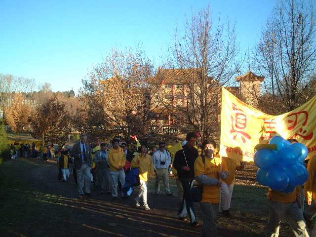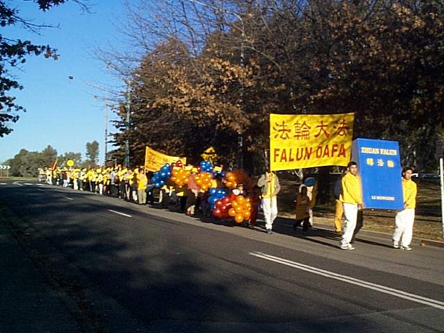 6月17日上午,在坎培拉举行2千人的竞走、慢跑比赛,中国大使馆是参赛人们必经之路,故对於路边悬挂的中、英文大法横幅,每个人都能看到,心里都要念一遍“法轮大法”、“真、善、忍”。弟子们抓住这个机会,派发真象资料,人们亲热地称呼:“啊,法轮功,法轮功!”非常友好地、礼貌地接受或索取大法简介及真象资料,看着在人口稀少的坎培拉一下有这麽多人拿到真相资料,大法弟子真有说不出的喜悦,人们真正的生命将会在对法轮功的理解和支持中找到美好的未来和归宿。