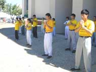 到了表演的时候了。午台上,伴随着悠扬的大法音乐,十几名大法弟子开始演示五套优美、舒展的功法,同时一位西方学员在前面做功法和有关大法真相的介绍。我们的背景画面是一道道金色的阳光穿破乌云照耀着大地。如此的场景与舞台上身着明黄T恤的大法弟子完美的融合成一体,给人们展示了一副法正天地的壮丽画面。人们认真的看着,忘记了周围嘈杂的喧闹声,仿佛置身于另一境地,台上台下一片祥和,令人感动。