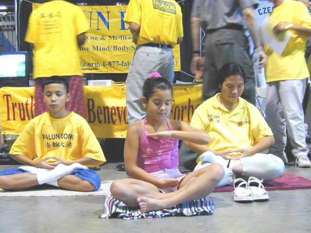 学员们两天一直在展位前轮流不停的炼着五套功法,不论是动功还是静功都吸引很多人驻足观看,许多人表示有兴趣参加我们的免费学习班。一位当地年逾七旬的学员,只见他红光满面,动作稳健,很难把他与七旬的老人联系在一起,让人不得不惊叹于大法的神奇。许多小孩子都跑过来看老师的教功录像,有几个更是认真的学习打坐,也许在他们的心中已埋下了要得法的种子。一个印度的小男孩认真的打坐了半个小时,并在活动快结束时,再次来到我们的展位前告诉我们,他周六会来参加我们集体炼功。