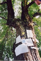 在维吉尼亚南方的古城,有一座由农庄改建成的艺文中心,绵延着山坡而上有棵大树,树上还有一个标记─中国榆树(Chinese Elm)树干上贴满了字条,有英文,德文,西伯来文,写着支持法轮功、停止迫害的字句,有的还引用的是诗句,希伯来文,请中国(江泽民)政府尊重人的信仰自由,让真理重现等等。