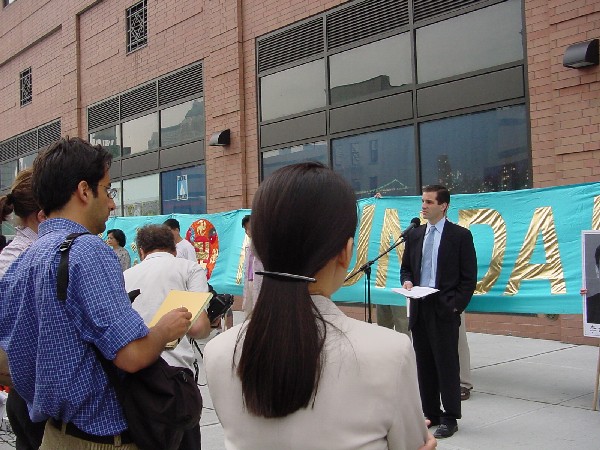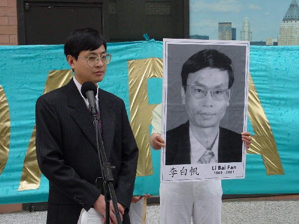 然后,詹姆斯.李博士, 是居住在费城的美国公民,在会上他讲述了他哥哥李白帆讲师最近被上海公安谋杀于“洗脑班”的案件。李白帆因为拒绝放弃修炼法轮功而被迫害致死, 在死之前,他被非法关押在劳教所近一年。而死后,警察阻止其家属检查遗体以掩盖死因。