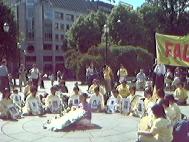二十一日下午,中国大陆驻旧金山总领事馆前再次出现抗议北京当局镇压大陆法轮功的示威队伍,他们挂起「虐杀妇孺残障、试问天良何在」、「二百二十九人死亡,停止在中国的杀戮」等标语和法轮功学员遭迫害的照片,并在音乐声中对着领馆大楼集体练功。