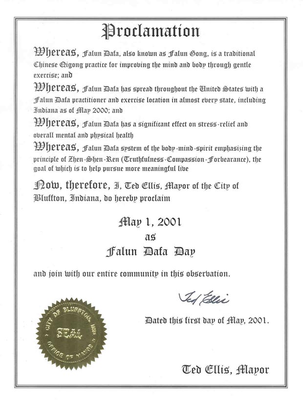 【明慧网2001年6月27日】美国印第安那州伯拉夫顿市宣布2001年5月1日为“法轮大法日”。