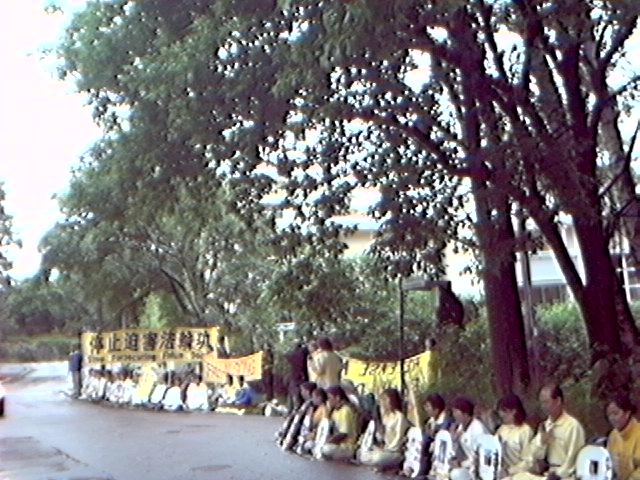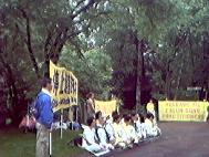 6月20日大约50几名学员连夜乘大巴士赶到瑞典首都斯德哥尔摩(Stockholm)。学员们不顾阴雨天气与当地学员一起汇集到了中国使馆前的草坪上。然而活动还没开始,天空就已变晴。12点整,大家齐发正念,同时有两名本地学员向使馆递信。堂堂一国大使馆,这时大门禁闭,学员多次按门铃都无人回答,记者们立刻摄取了这一镜头。