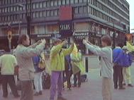 下午洪法团来到中心广场,开始集体炼功。芬兰人第一次看到如此祥和壮观的场面。我们准备的材料又加印许多次都难以满足需求。过往的大型旅游车上的乘客热情的向我们挥手,很多人竖起了大拇指,警察和行人都向我们点头致意。