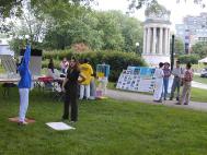 西人学员(60多岁)马克思站着发了一天报纸。他的腿里有钢钉(战争时受伤),“这么多人得闻法,我很高兴。”他说。简在我们炼功时在会场解说。她说这是去我怕心的。大家为他高兴。两天发生太多的故事。我们感到整个节日现场都在我们的场中。功友们演示时感到场很强。有位西人学员刚到公园门口就感受到强大的能量场。