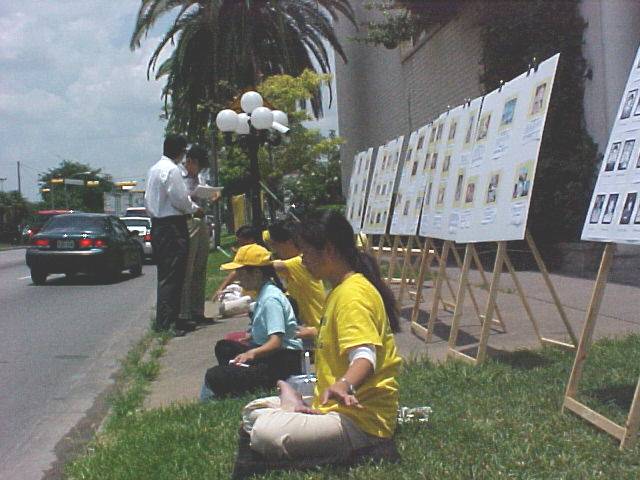 中文媒体准时赶来参加;一位大法弟子详细地向记者叙诉中国江泽民集团近日打压法轮功升级、死亡人数增加的现象,记者认真地将这些记录下来,不时地提出问题,记者观看了所有的八张大展板,并拍摄展板上的图片,这些展板的图片是江泽民犯罪集团对法轮功和法轮功学员残酷迫害的记录,大法弟子还专门给了记者一些有关法轮功学员被迫害的资料和天安门"自焚"真相的录像带。正值中午时间,中领馆午休,前来办理签证的中西人员在等待期间,纷纷来观看展板,大法弟子向他们一一散发了中英文有关揭露邪恶的资料。一位美国中年妇女认真地观看法轮功学员受酷刑后遍体受伤的图片,她看着看着,悲伤的泪水不停地流下来,一位大法弟子对她说:"我们到中领馆前,不是反对政府,是为了呼吁中国让法轮功学员享有公民应有的基本权利和信仰自由,中国的法轮功学员仅仅为了炼功,为了信仰真、善、忍,受到了最残酷的迫害。"