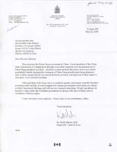 加拿大国会议员肯斯.马丁博士(Dr. Keith Martin)2001年5月22日致信外交部长约翰.曼利(John Manley),呼吁加拿大政府关注法轮功在中国受到的迫害。
