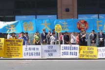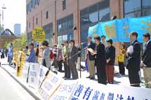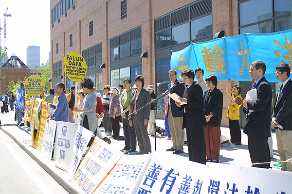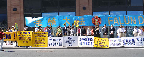 在领馆外学员们炼功、发正念,并用中文宣读了呼吁信。许多领馆工作人员都从窗口探头观看。学员在发言中强调法轮功学员反对的是江泽民镇压迫害法轮功的政策,而不是中国政府。这场镇压已经严重危害了中国的社会稳定,政府信誉和人民生活。希望中国人民能够认清江泽民为一己之利残酷迫害法轮功的罪恶,给法轮功以道义上的支持,帮助中国政府和平解决这一危机。