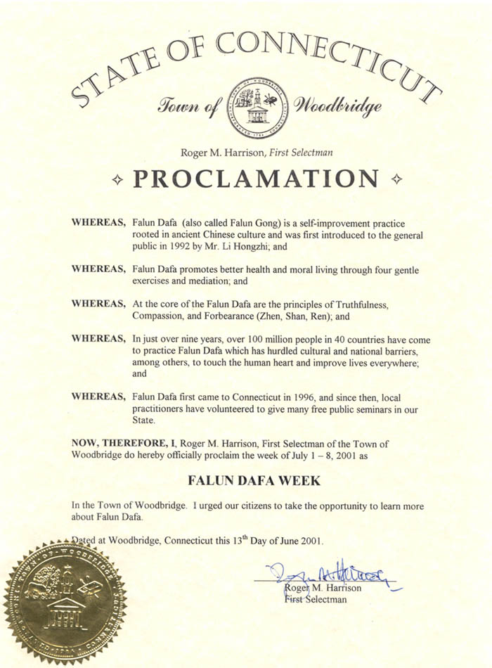 【明慧网2001年7月1日】康涅狄格州木桥镇宣布2001年7月1日至8日为“法轮大法周”。