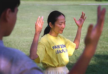 九名男女老少围成一个圈,眼睛闭上,盘腿打坐,胳膊悬在空中,几分钟换一个姿势,他们在静静地炼着法轮功。