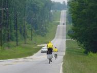 7月8日,早上出发。今天是第四天山颠道路了。遇到太陡的坡,有的学员把整个身体都压在脚镫子上也不能使自行车行进了,他们只得推着车走。他们基本上习惯了这种道路。一路虽然比较艰苦,但还算顺利。几个小时后,他们路过了一片很大的桃园,桃树布满山坡,桃子淋漓满枝,很多园工在园子里工作。当他们的自行车队经过时,两个园工从园子里走出来好奇地看着他们经过。他们下了车走过去和他们说话,告诉园工们他们从哪里来,到哪里去。不一会,围过来4,5个园工。他们告诉园工们法轮功是什么,在中国发生了什么事情。一个园工瞪大了眼睛,难以置信的问,“你说什麽?是中国政府在杀人吗?这真是太可怕了。”对很多乡村的善良的美国人来说,在中国发生的杀人和残暴行径对他们是完全无知和难以想象的。园工们对学员们为此付出的努力而感动。一个园工从桃园里拿出3个硕大的桃子送给三个学员。他们从没有见过这样大的桃子。学员们很感动,要付钱给园工们。园工们说他们不能收钱。园工们嘱咐学员们路上小心并祝他们一路平顺利。