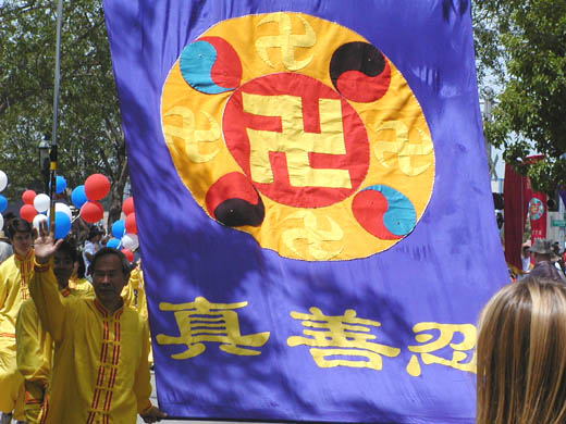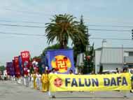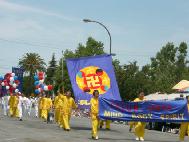 7月4日是美国独立日,在北加州湾区有多个城市举行了盛大的游行庆祝活动。圣荷西地区大约60多名学员参加了红木城的庆祝游行。由身穿黄色炼功服和纯白色服装学员组成的队伍特别引人注目。中英文书写的法轮大法横幅前头引路,大法轮旗跟随其后,中间是身穿白色服装,手执红、蓝、白色气球的学员队列,后面是制作精细的法轮彩旗,普度、济世大法音乐响彻云霄。