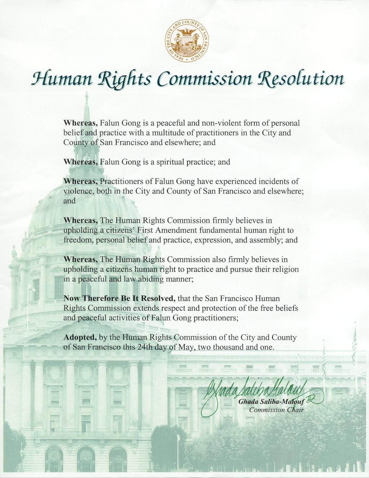 【明慧网2001年7月13日】加州三藩市、郡人权委员会(Human Rights Commission, City and County of San Francisco, California)2001年5月24日通过决议案,尊重并保障法轮功学员信仰和和平炼功的活动。