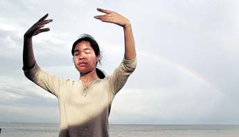 时报照片:在圣彼得堡北岸公园,坦帕的姚兰举起她的胳膊,做出法轮功的一个优美姿势。此时一道彩虹正出现在坦帕湾上空。摄影/迈克尔-容道