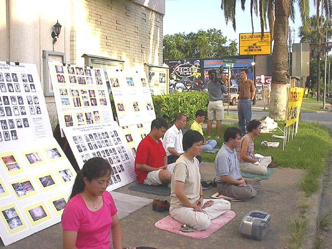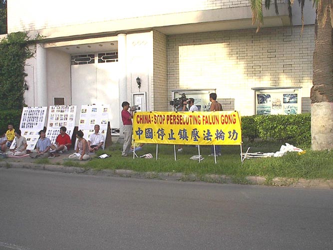 【明慧网2001年7月15日】在接连传来被非法关押在哈尔滨万家和长林子劳教所的十几位法轮大法学员惨遭大规模虐杀的惨案之后,休斯顿法轮大法学员连日来在中领馆门前聚集,紧急呼吁国际社会共同制止江泽民集团对法轮功学员大规模虐杀的罪恶行径。