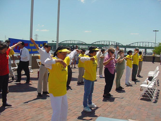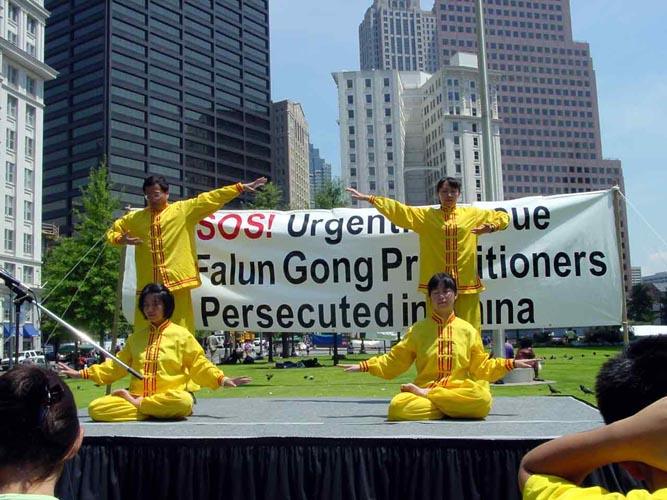 12点10分,发布会正式开始,当地的学员们表演了祥和的法轮大法五套功法。接着,学员宣读了新闻发布会开幕词,说道,亚特兰大法轮大法学员的这次开车旅行,是全球性紧急营救在中国受迫害的法轮功学员活动之一,目的是营救在中国受迫害的法轮功学员,呼吁立即停止对法轮功的非法迫害。此后,宣读了美国国务院发言人Richard Boucher“法轮功在中国”的声明。