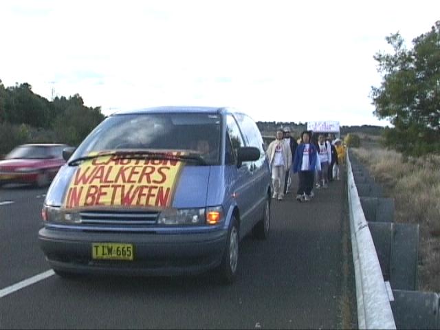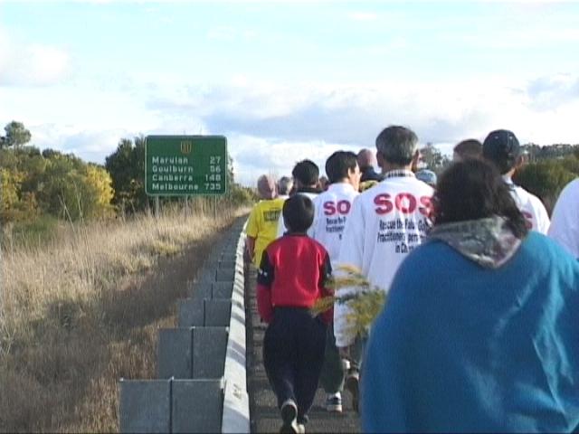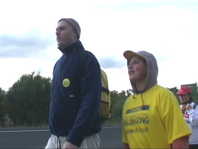 上午10点钟,当我们在一个公园停下来休息时,二个西人被“SOS”标志和“Walk to Canberra”的旗帜吸引,来到我们的休息地点,几个大法弟子递给他们“SOS”传单。并告诉他们中国正在发生的事情。6月份发生在中国的万家惨案,及7月份又有10多位法轮功男学员被黑龙江长林子劳教所酷刑折磨致死。他们对江泽民犯罪集团的残暴行径感到不可思议、不可理解。同时,亦对人们用生命捍卫法轮大法的勇敢精神所震撼,急于想更多了解法轮功,马上学、炼法轮功。大法弟子当即给他们留下了明慧网址,他们表示回去後尽快从网上找到《转法轮》宝书及教功信息。