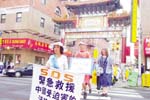 为营救在中国大陆受迫害的法轮功学员,二十名从波士顿、纽约以步行方式抗议的法轮功支持者,十日下午六时经过费城华埠前往市政厅,沿途吸引了主流媒体及行人的注意。(刘麟摄)