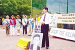 李江帆博士十一日在费城独立钟展览馆前举行的记者会中控诉在大陆练法轮功的哥哥,上海华东师大教师李白帆(图中所示)今年四月十四日死于转化班的冤屈,一旁立者为参加步行至华盛顿的法轮功学员。(刘麟摄)