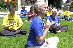 在周日的步行之前,基特利的马库斯.盖尔同其他法轮功学员一起在约翰保尔琼斯公园打坐