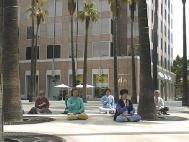 他们看起来象树下的活雕像。十几个人腰板挺直地坐着,静静地围成一个圈。悲悯的东方弦乐从一个放音机中传出,令人头脑中浮现出淡淡的湖影和落日的余辉。