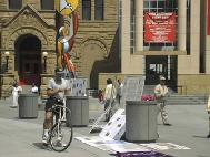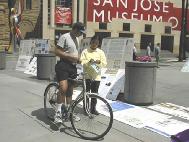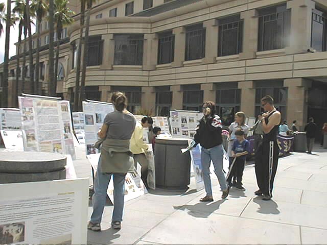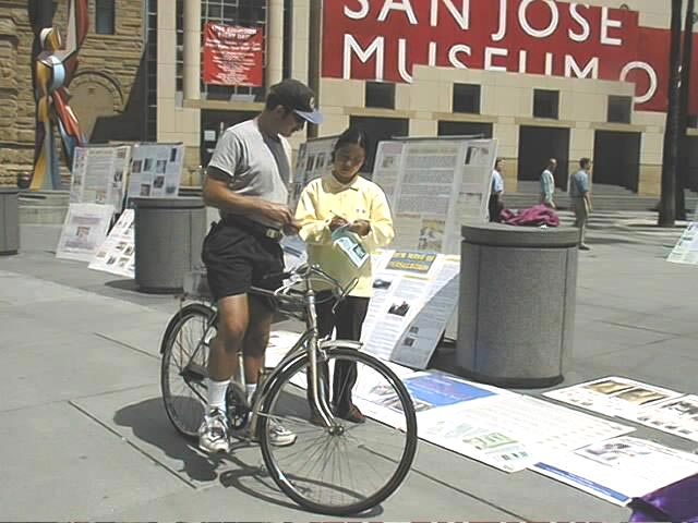 接近午餐时间的圣荷西市中心,行人逐渐增多,许多人仔细的观看图片,并阅读学员们送给他们的资料。一位女士帮助扶起被风刮倒的看板,并向学员索要更多的资料,她说,“我在一家大公司工作,那儿还有不少中国雇员,我想把这些资料拿回去给我的同事看,而且,我还想把它贴在我们的消息板上。”